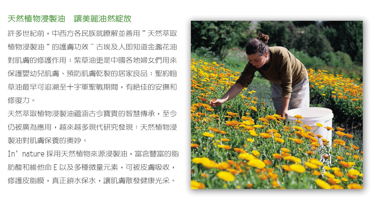 古埃及人即知道金盞花具有護膚作用,現今美國家庭人喜歡將金盞花油,做為乾燥肌膚的潤膚保養品,功效從古到今就倍受肯定。In'nature金盞花系列採用有機金盞花浸製油、全成分皆為植物萃取油,親膚性佳,一滴立即滲透,讓肌膚呈現油水平衡的健康狀態。