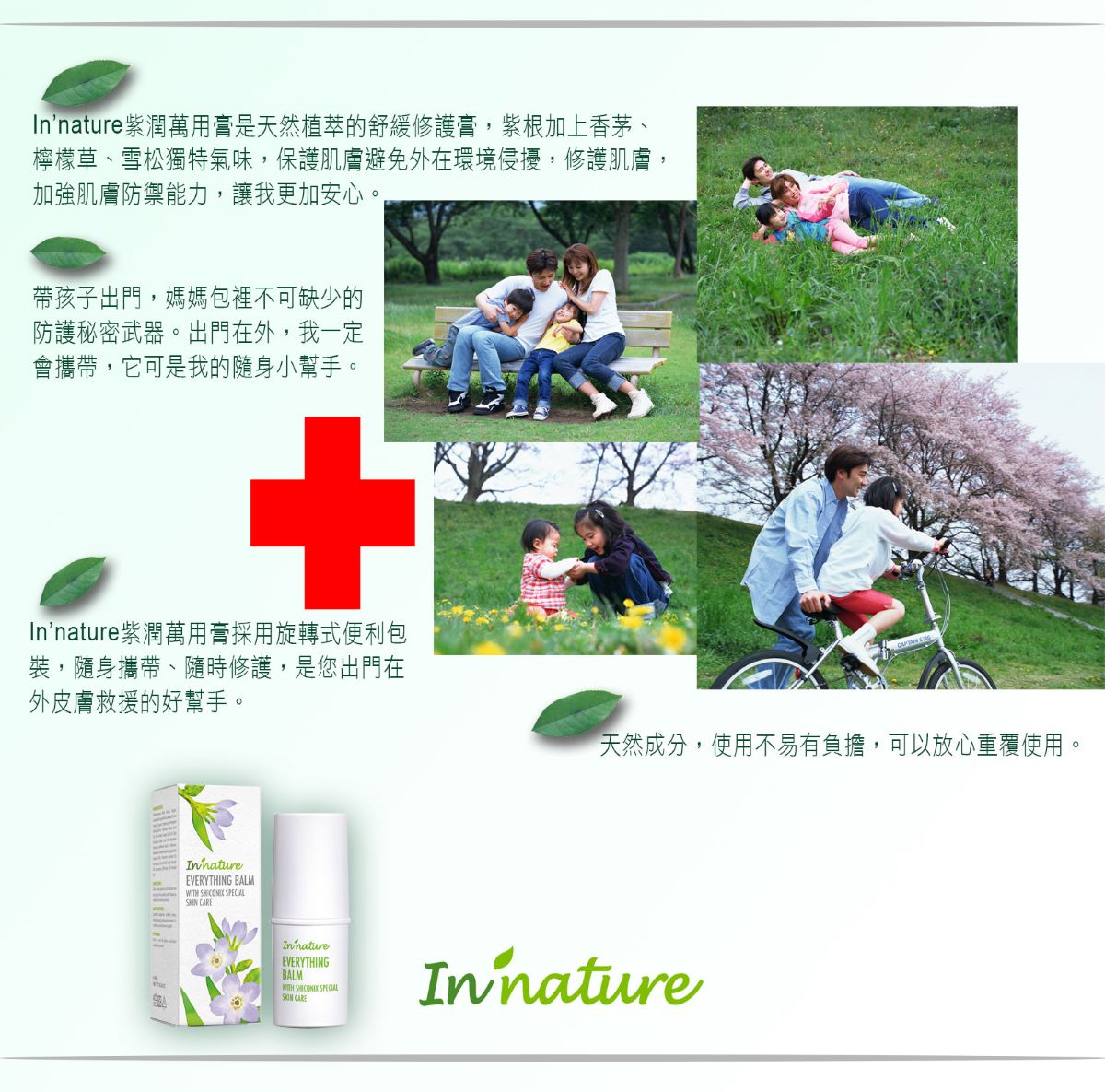 紫根,為紫草科植物新疆紫草 Arnebia euchroma (Royle) Johnst 、紫草Lithospe rmum erythrorhizon Sieb. et Zucc. 或内蒙紫草Arnebia guttata Bunge 的干燥根。In'nature採用新疆軟紫草根,以天然萃取植物油,萃取天然紫根精華,可獲致紫根關鍵成份—紫草素(Shiconix),並能達到品質安定的品管標準。