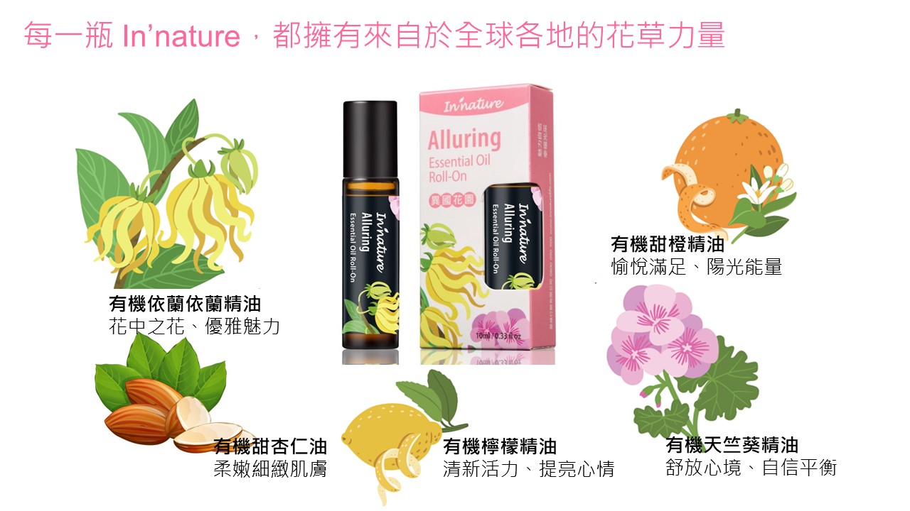 依蘭伊蘭精油被稱為“花中之花”,優雅時尚的花香、羅曼蒂克的浪漫情調,帶來正能量,循著婉轉悠遠的香氣,找到從容自信。天竺葵精油舒放心境,交織初熟飽滿的甜橙與檸檬精油,彷彿耀眼的花園綠洲,在異國花園中翩翩起舞。完美豐盛的植物複方,帶給人幸福感,個人魅力再升級!