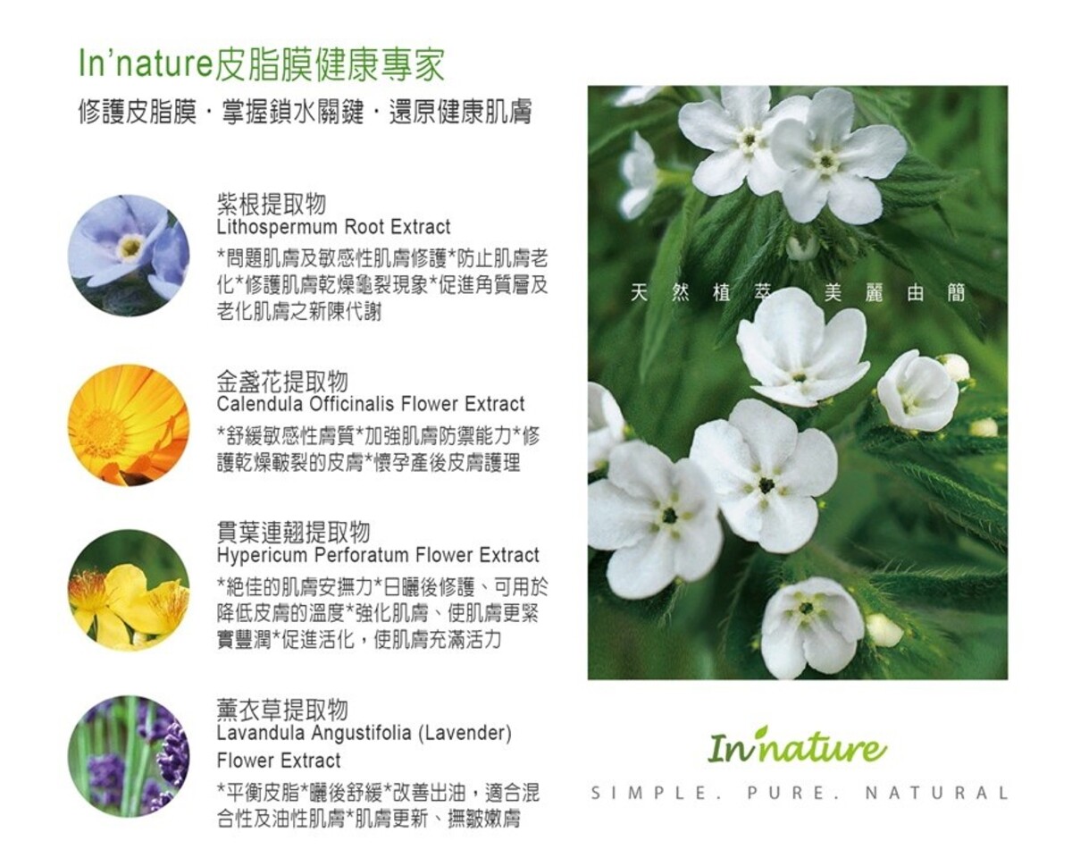 In'nature紫潤系列主要成份 – 紫根,源自中日草本外用經典,為滋潤保水、改善乾燥肌膚、調理肌膚、改善膚質、維持肌膚彈性,近年來在中日各國已有廣泛研究及關注。
