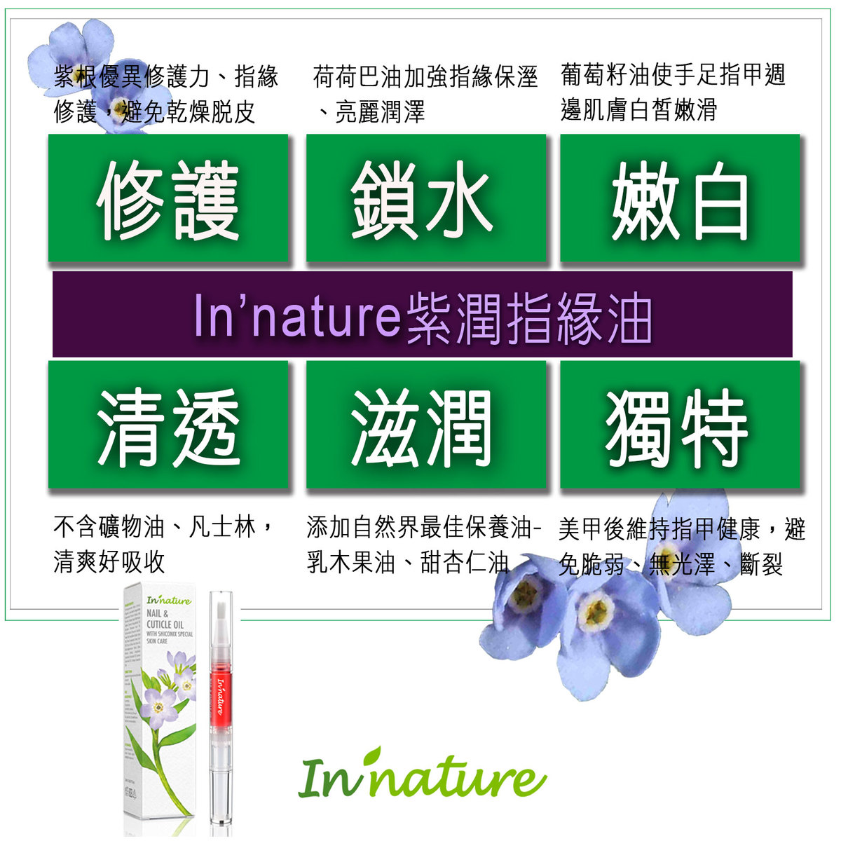 In'nature採用 新疆軟紫草根,以天然萃取植物油,萃取天然紫根精華,可獲致紫根關鍵成份—紫草素(Shiconix),並能達到品質安定的品管標準。